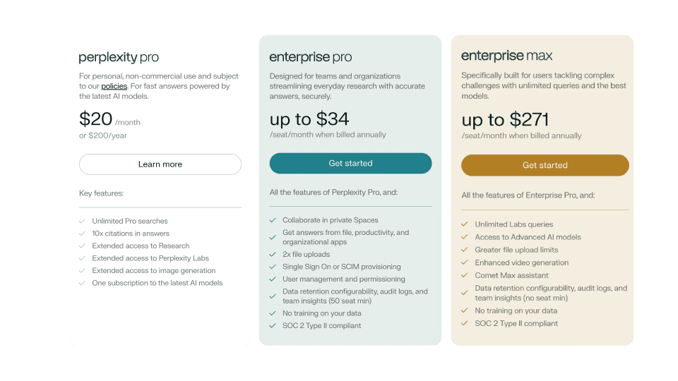 - Offers Perplexity Pro ($20/month), Enterprise Pro ($40/seat/month), and Enterprise Max ($325/seat/month), with Enterprise Max providing unlimited Labs access, Comet Max assistant, enhanced video generation, and premium AI models.