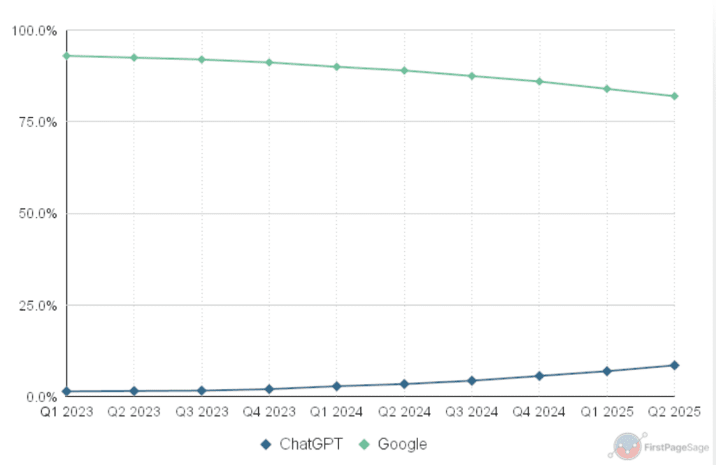 The First Page Sage market share report analyzing Q2 2025 data reveals that Google still commands over 80% of all digital queries globally, while ChatGPT accounts for 9.0% of queries. But this topline number obscures crucial differences in what people use each platform for.