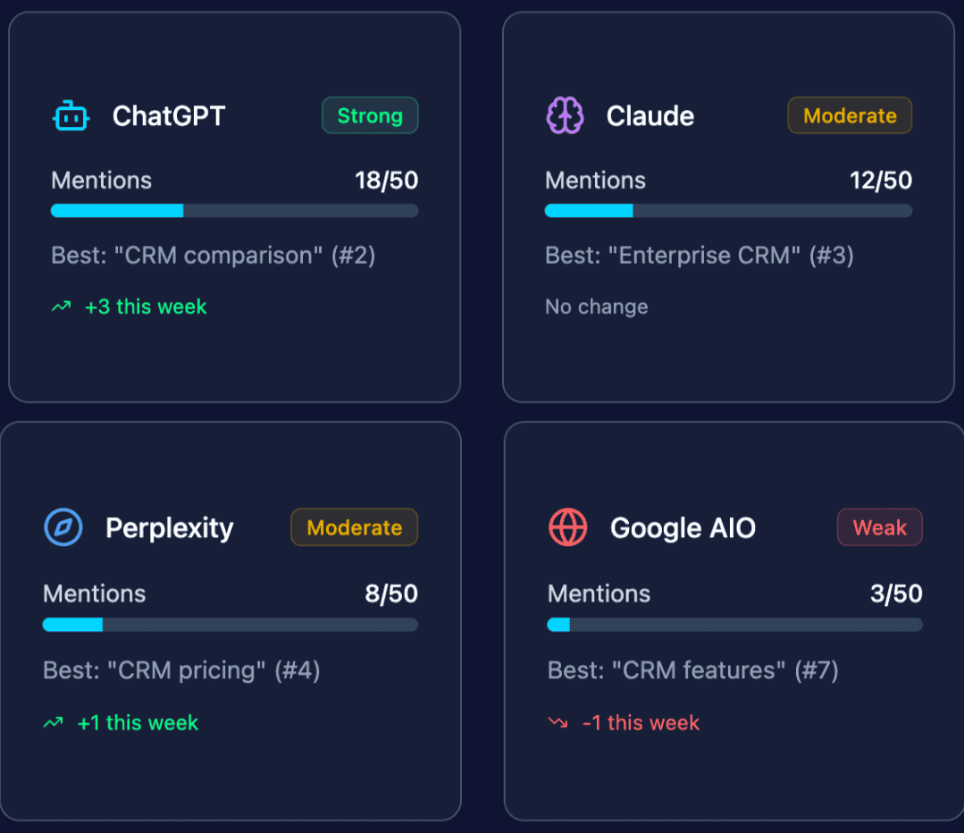 "Finally, a tool that shows us exactly where we stand in the AI search landscape. The competitive insights are invaluable."